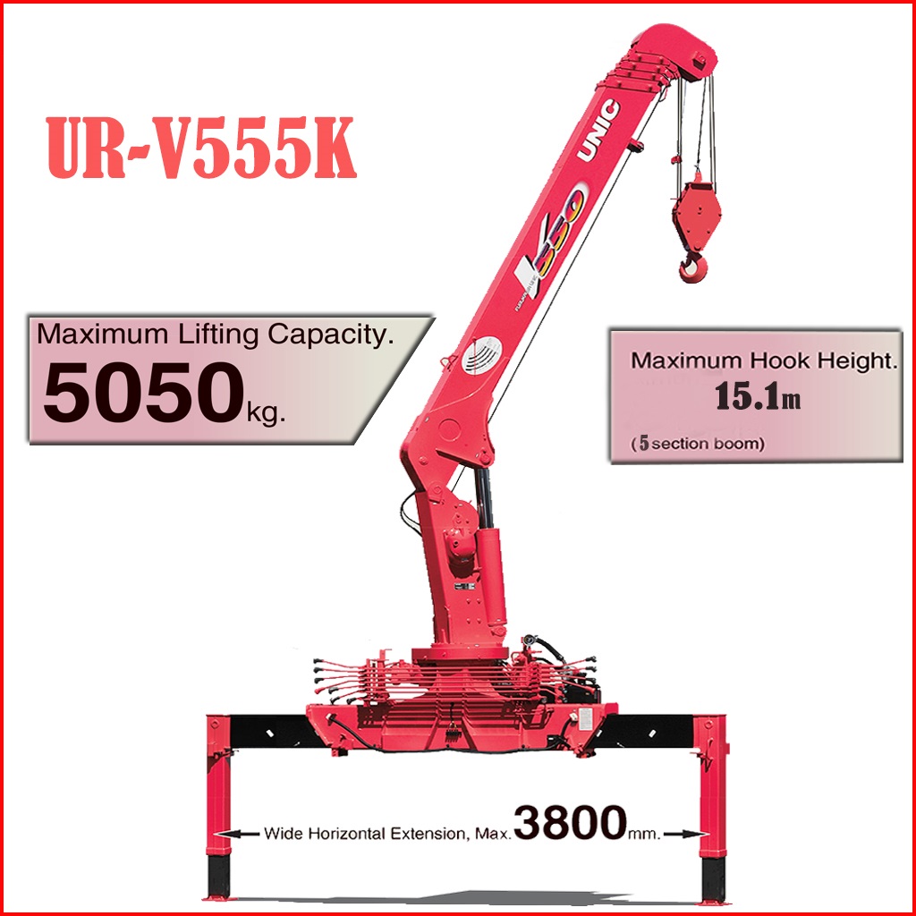 Cẩu Unic 5 tấn có Series UR- V550 là dòng cẩu tầm trung được hãng sản xuất để lắp đặt trên một số xe tải có Tổng trọng lượng từ 12 tấn đến 32 tấn. Dùng hỗ trợ con người trong việc nâng hạ và vận chuyển hàng hóa.
