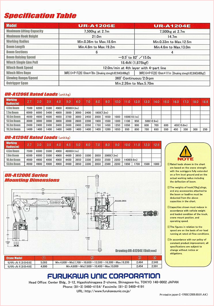 THÔNG SỐ KỸ THUẬT CẨU UNIC 7 TẤN SERIES UR-A1200