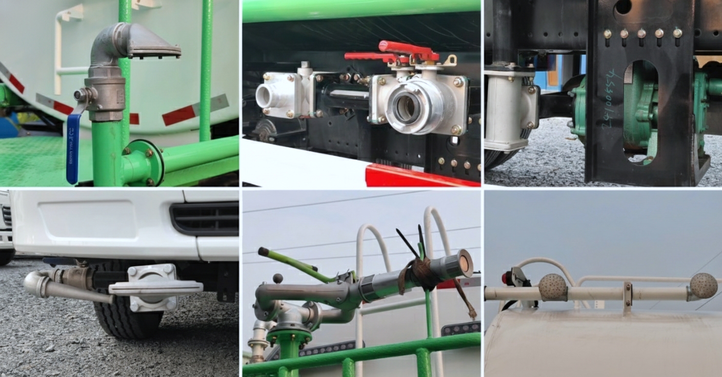 Hệ thống đường ống được bố trí khoa học, sử dụng vật liệu chịu áp lực tốt. Xe trang bị péc phun trước rửa đường, péc phun hoa sen hai bên tưới cây và péc phun sau xoá vết cùng súng phun cao áp phun xa, đáp ứng đa dạng nhu cầu sử dụng thực tế.